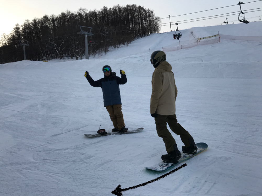 接着就移动到蓝色文本所示的正转位置吧。使用脚尖的边缘来横越斜坡。顺道一提当要从背转位置切换成前转位置的时候,先蹲坐在斜坡然后一气呵成转换方向会比较好喔。背对斜坡或许一开始会觉得很可怕,重点在于跟用脚尖侧横向滑行的相同位置处留心用前脚加速。