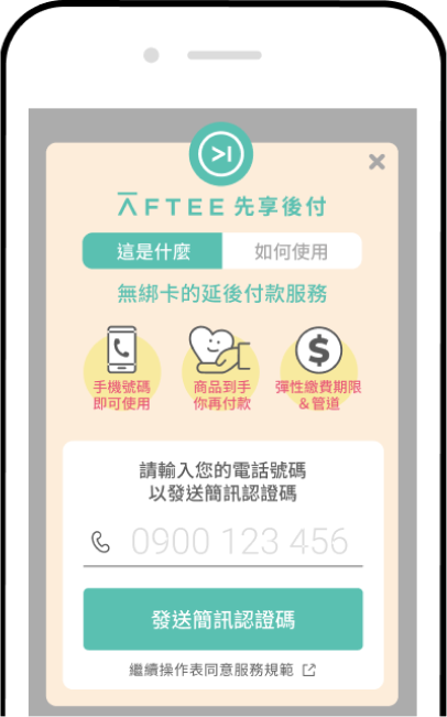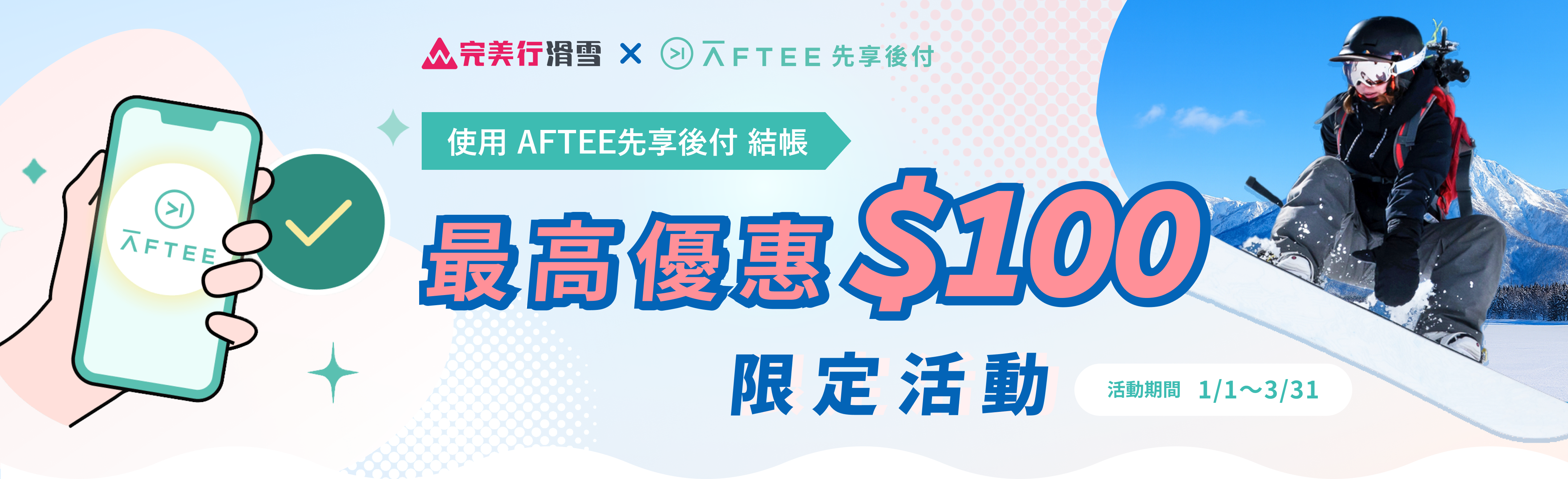 活動期間內,凡AFTEE舊用戶於 完美行滑雪 消費後,選用 AFTEE先享後付 付款,並使用 AFTEE APP 繳費後,即贈 AFTEE 50元優惠券。