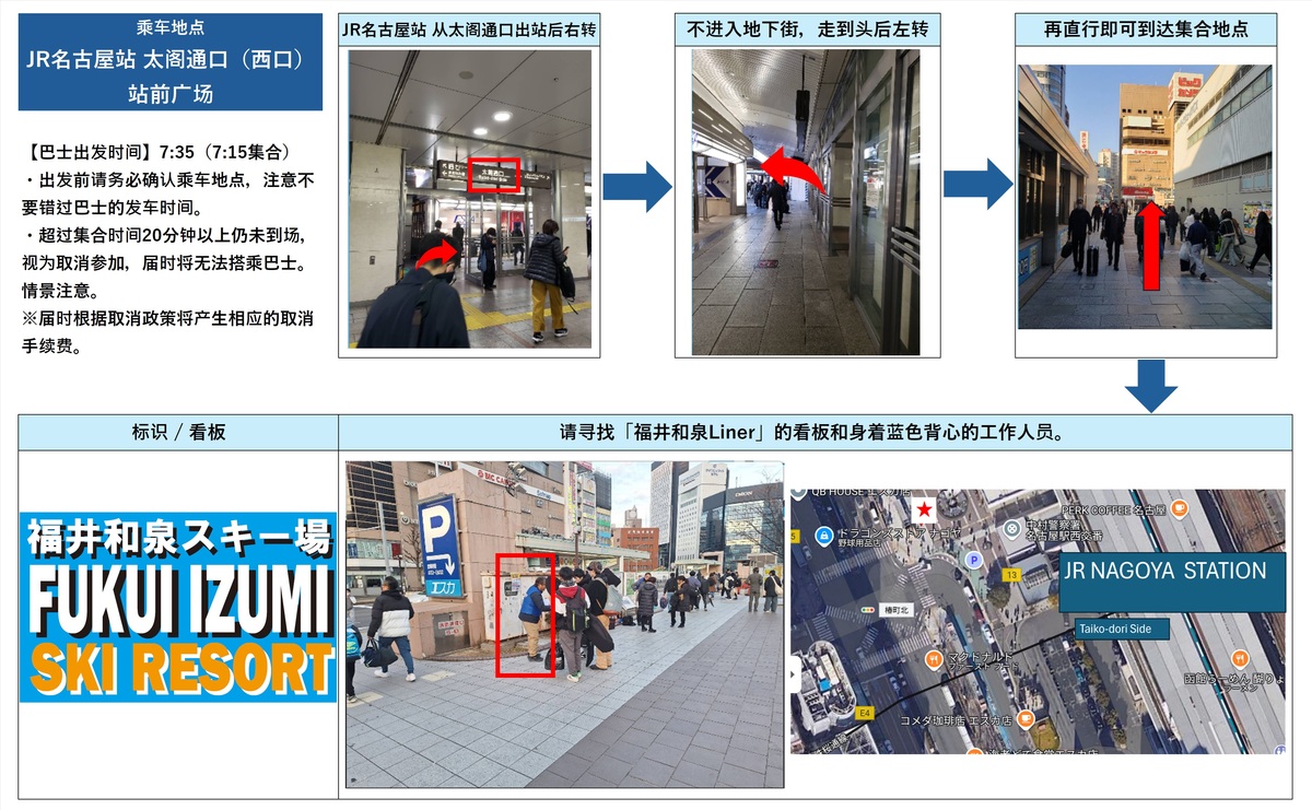 【去程巴士出发时间】7:35(7:15集合)从名古屋站太阁通口(西口)出发 ⇒ 9:50到达福井和泉滑雪场