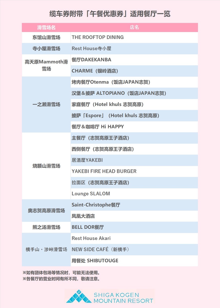 ①志贺高原全山通用2日券 ②价值JPY1,000的餐券×2张(仅限午餐使用)