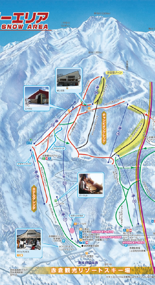 AKAKAN赤仓观光度假滑雪场是在昭和12年12月12日,日本第一家获得国际认证的滑雪场。从酒店第5缆车下车处起,可以享受达4公里的长距离滑行。雪道内设有丰富的自由式滑雪公园。若携带还不能进入滑雪场小朋友前来,可以试试儿童专区「小不点广场」。就位于大型停车场旁,十分便捷。