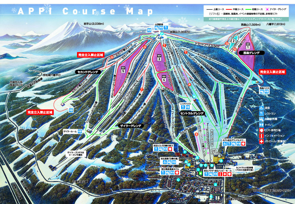 安比高原雪区拥有21条雪道和顶级雪质!压雪雪道的爽快感和粉雪滑行的灵活感别具魅力。安比高原位于北纬40度,雪质极佳,有着得天独厚的环境和位于山体北坡的优势,可以在稳定的积雪条件下畅快滑行。从山顶向下延伸5.5km的速降雪道连初学者都能轻松滑行,下雪时还可享受长距离粉雪滑行,不下雪时则有自然蘑菇道绵延不绝的2km非压雪雪道,刺激又有趣!除此之外,在西森区和赛勒(SAILER)区还设有林间雪道,可以在此尽情享受安比高原的优质粉雪。