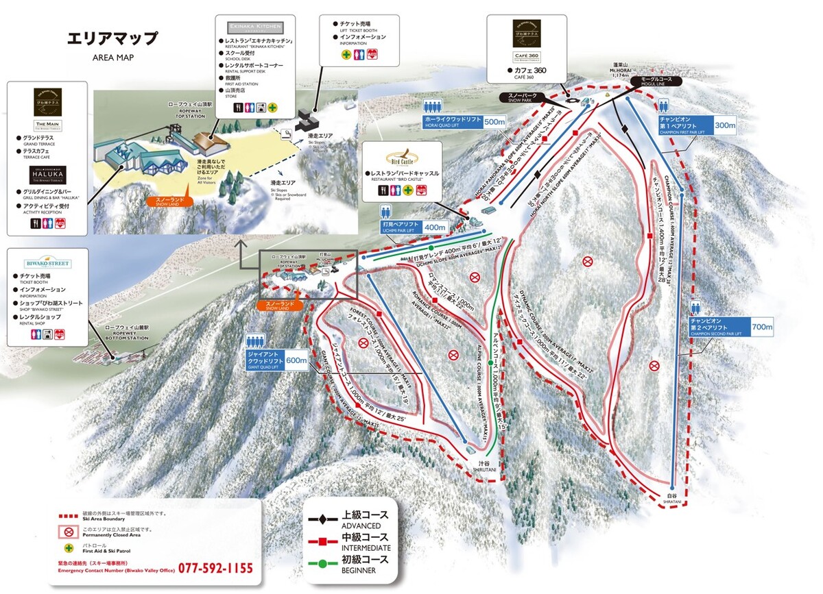 琵琶湖山谷滑雪场交通便利,从京都东高速收费站出发仅需40分钟即可抵达。游客可以在眺望琵琶湖的绝美景色的同时,尽情享受滑雪的乐趣。滑雪场内有9条引以为傲的多彩雪道。游客可以从观景台眺望琵琶湖的冬日美景,眼前的银色世界美得令人窒息。滑雪场还有很多适合成年人的雪上活动,例如滑雪橇、雪地高空滑索和管道滑雪等。