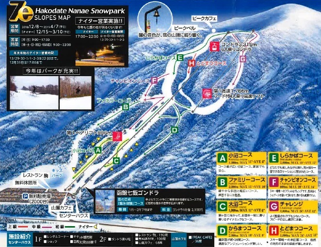 在可以远眺驹岳与大沼壮丽美景的林间雪道上,设有可直达山顶的6人吊箱缆车。无论初学者还是中级者,都可以一边欣赏美景,一边享受长距离的滑行乐趣。全家出游也能玩得尽兴!山顶还有可同时享受美食与风景的PEAKCAFE。