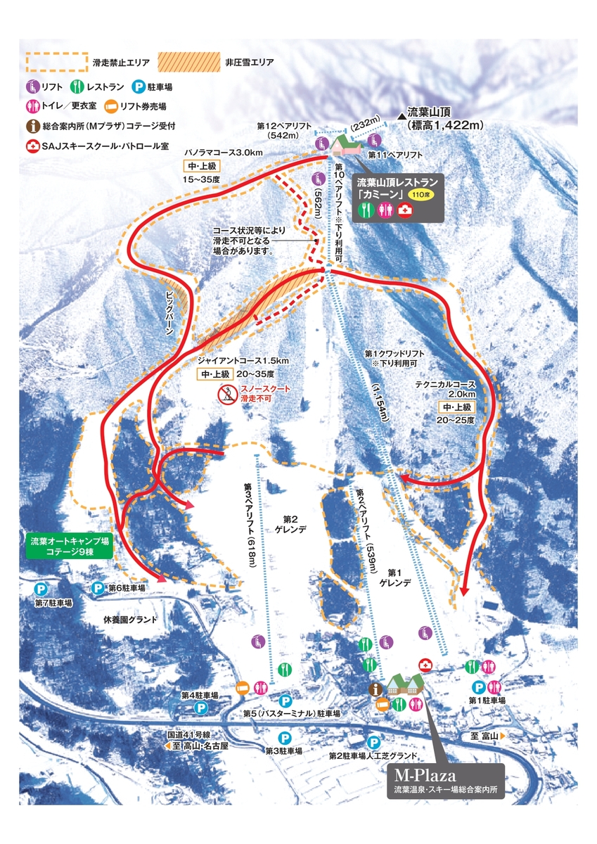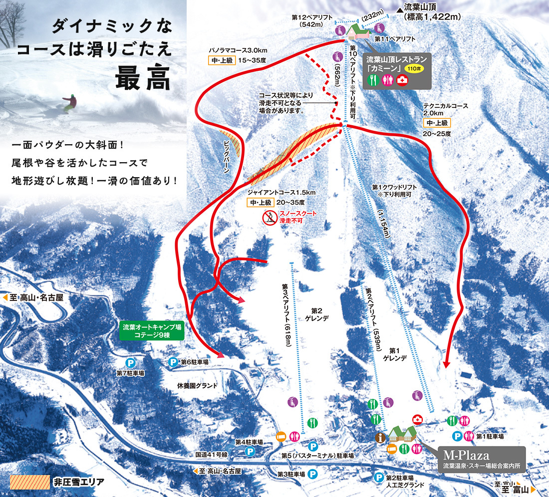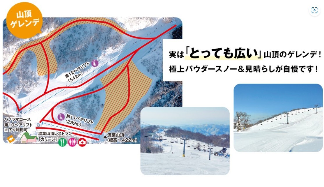 坐拥绝佳眺望的山脊和陡坡,设有宽阔的缓坡与种类丰富的雪道。从新手到高玩都可以乐在其中。山顶360°无死角享受群山美景。流叶山后还隐藏着山毛榉林雪道,吸引力众多粉雪爱好者。运气好的时候还能看到云海和树冰。山顶设有缓坡,初学者也能前往享受美景。可以乘坐索道下到山麓,即是不太敢挑战中高级雪道也可放心上山。温泉和当地料理也不容错过!