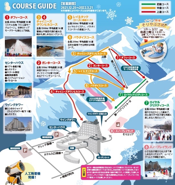 设有缆车券售票处、提供简餐的餐厅、滑雪学校报名处、Super Kids Club(SKC/儿童学校报名处)、免费休息区。欢迎自由使用。