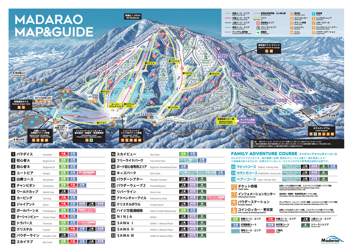 区域较小但设施丰富,无论初学者还是高手都能在这里享受公园乐趣。1月将设置跳台,2月将利用地形打造自由式公园,3月为人工雪打造的蘑菇道。