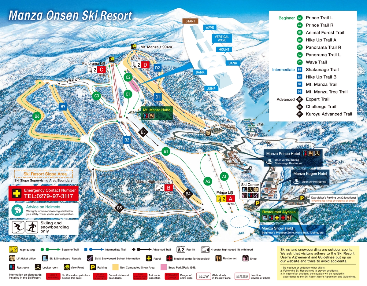 有「粉雪万座」之称而闻名的滑雪场,拥有日本数一数二的粉雪。在海拔1,994m的山顶可以看到富士山!滑雪场内布局紧凑合理,兼具平缓与陡峭的雪道,还有绝美树冰林间道、非压雪区、可眺望浅间山及妙高山全景的雪道等。无论初学者到高级滑雪者都可以在这里尽情享受滑雪的乐趣。小学生及学龄前儿童缆车券免费!设有动物看板的「动物之森路线」也很受欢迎。从附设的酒店步行0分钟!还与日本硫磺含量数一数二的万座温泉街相邻。
