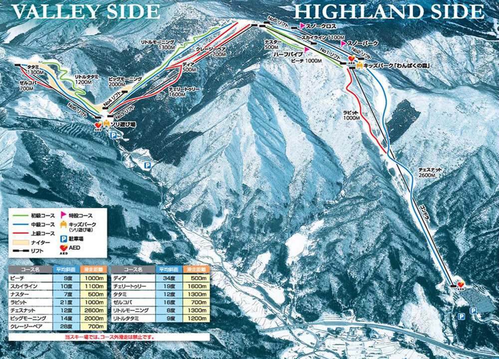 秉持的理念为「初学者到高阶者都能开心享受滑雪的乐趣!」高速4人缆车,搭乘毫无压力!滑雪场后半部直通半管滑雪场!