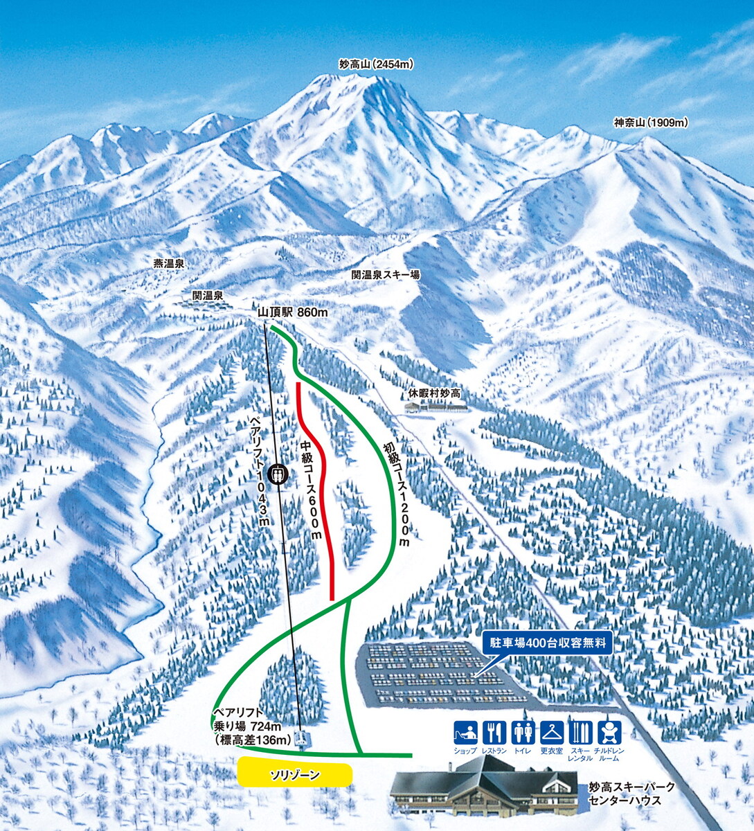 妙高滑雪乐园拥有全长1.2公里、平均坡度7度的缓和林间雪道,相当受初学者及家庭客群欢迎。