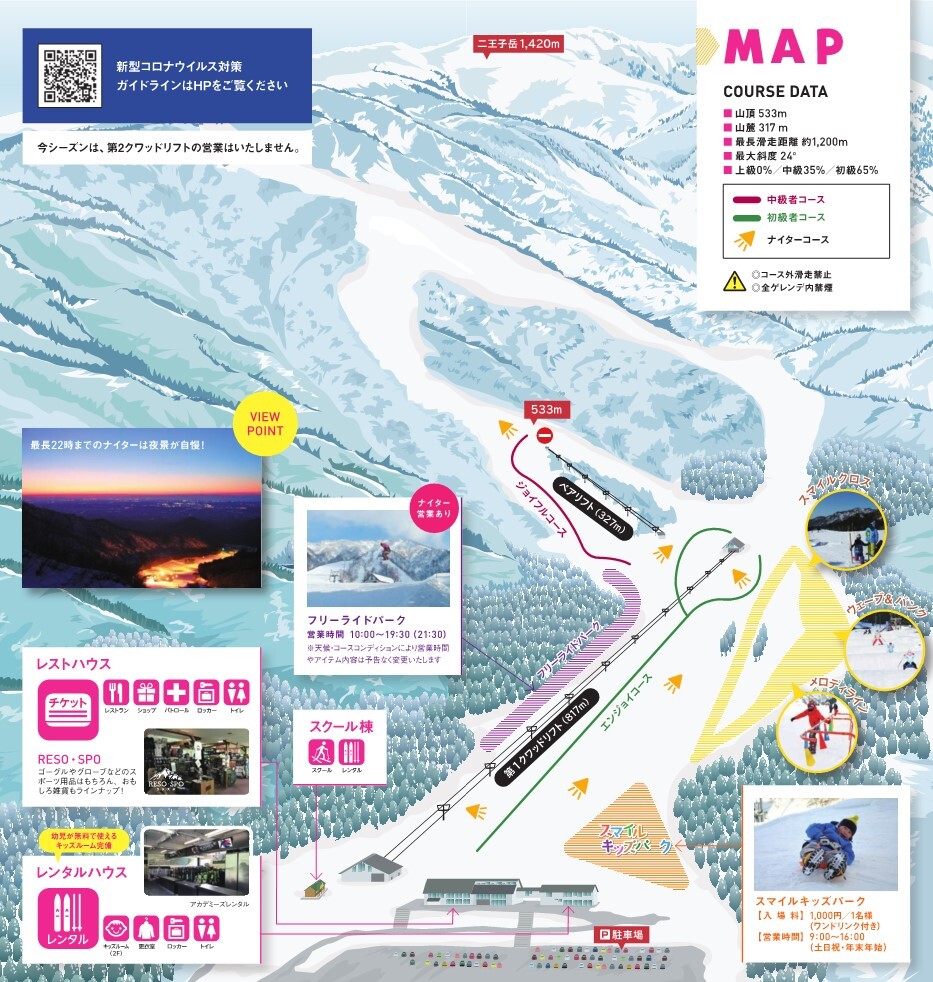 滑雪场距离新潟市内40分钟车程,拥有丰富的降雪量和上等雪质。 尤其是Enjoy雪道,坡度平缓,即使是初学者也可以轻松享受滑雪的乐趣! 【雪MAJI】19~22岁可享受2次免费缆车券,第3次起可以享受折扣优惠。18岁【Smile18】可每天享受免费缆车券。 每周五和周六夜场营业至22:00!下班后也可以轻松前来♪