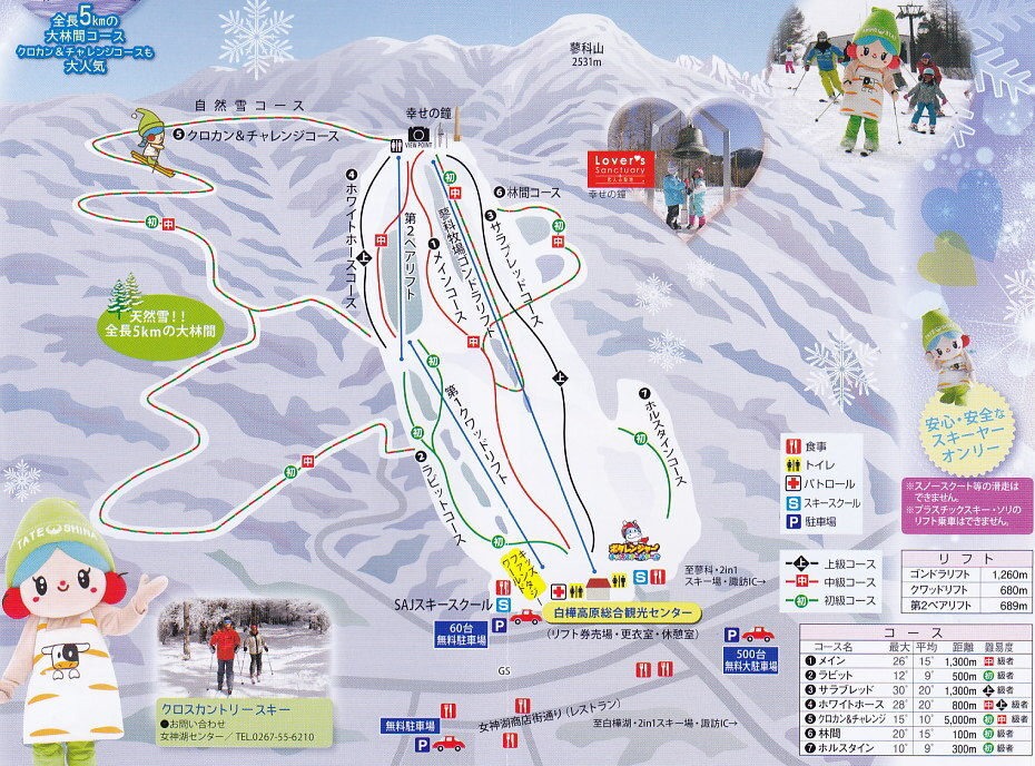 可以搭乘距离全长1260米的吊箱缆车空中漫步。眼前是白雪覆盖的日本百名山之一的蓼科山,另一侧可以看到北阿尔卑斯山和女神湖,地理位置绝佳。晴天率80%,山顶景色美不胜收。