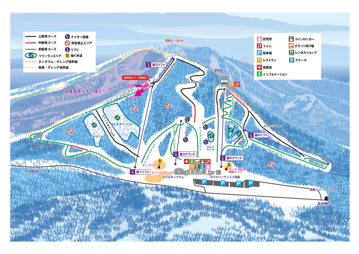 距离TANGRAM斑尾酒店0分钟!非常受家庭游客喜爱的滑雪度假村。在海拔1,100米的山顶上还有以野尻湖和信越五岳的雄伟景色为背景的拍照打卡地。从山顶一路延伸至山脚处酒店的雪道布局,设有儿童、初学者区域、以及非压雪的树林区雪道。滑雪区域与斑尾高原滑雪场相连,滑腻了还可以去隔壁雪场玩耍。酒店内设有室内游泳池和露天温泉,无论是家庭出游还是和亲朋好友前来,都可以在这里尽情享受美好的度假时光。