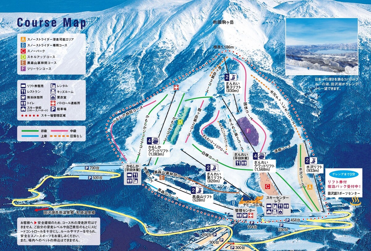 田泽湖滑雪场是日本东北地区最具代表性的滑雪场,设有蘑菇道、积雪深厚的非压雪雪道,以及宽阔的中、缓坡度雪道等。在雪场中可将田泽湖美景尽收眼底。同时设有小朋友喜爱的儿童广场,以及适合练活的公园。雪场附近还有全国闻名的乳头温泉乡等天然温泉,可体验日归泡汤的乐趣!