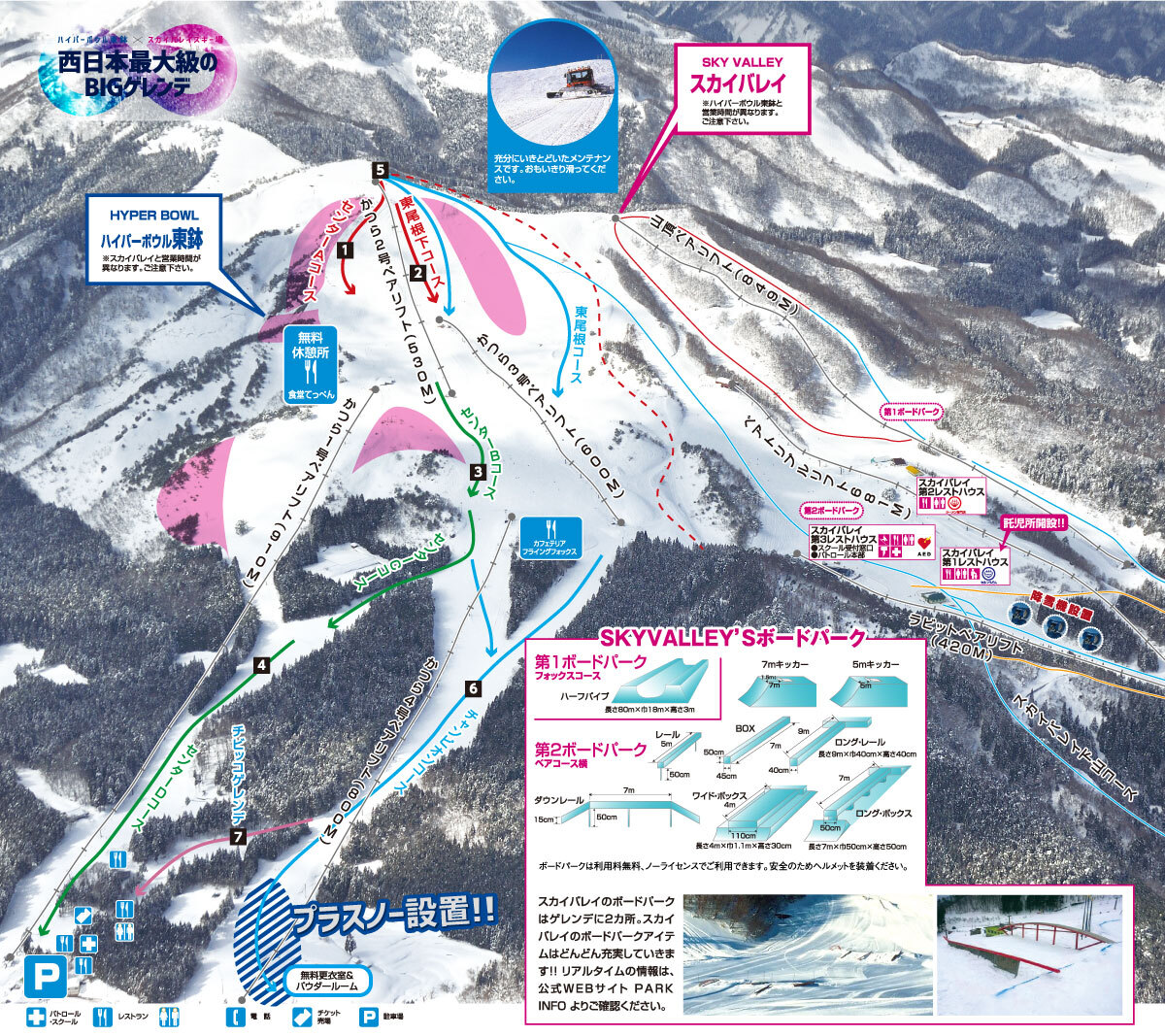 拥有体验过一次就会上瘾、超受雪友喜爱的超宽山顶雪道。以适合中~高级爱好者的雪道为主,同时也提供让初学者可以放心滑行的迂回路线。还可以凭通用券前往相邻的Sky Valley滑雪,乐趣翻倍。除了单双板滑雪外,还可以体验雪地滑板车等全新项目。下车后眼前即是滑雪场,交通便利。儿童乐园门口设有Kerohachi吉祥物拱门,萌萌的身姿迎接每一位小朋友的到来。园内设有Sunkid(魔毯),方便游玩!
