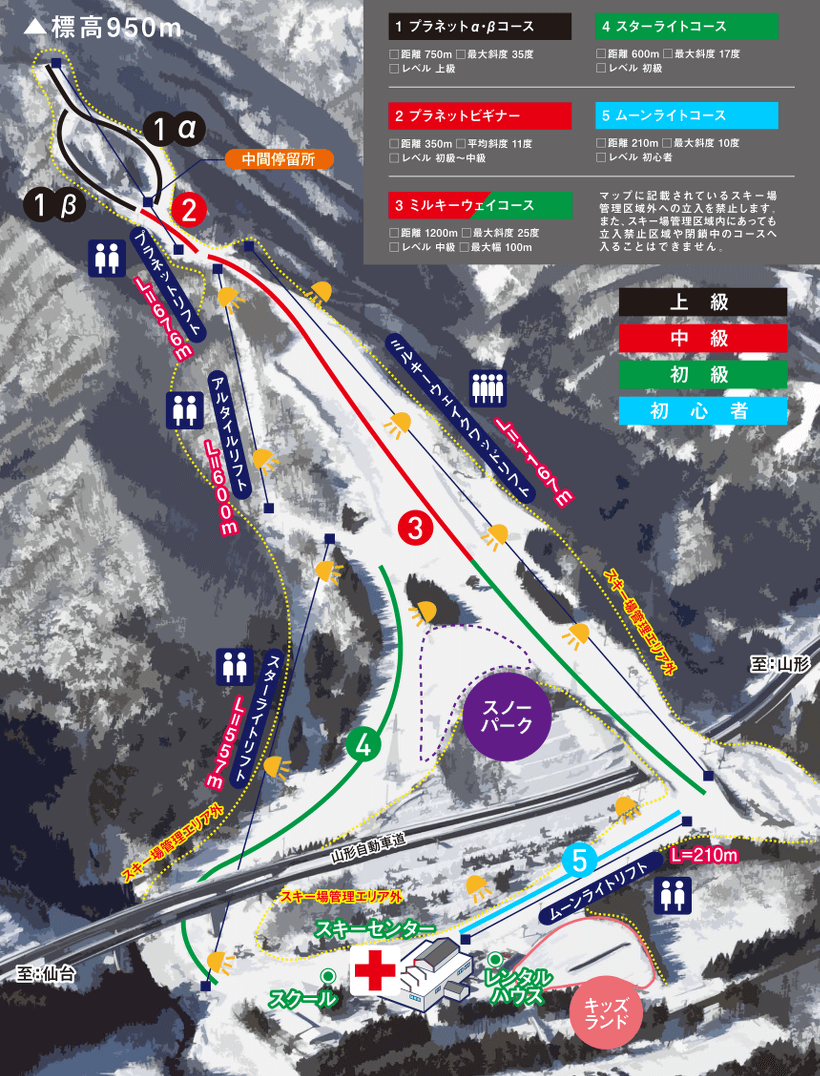 川崎町毗邻宫城县的仙台市与山形县的山形市。St.MARY滑雪场位于这两座城市之间的国道286号沿线,附近有青根温泉和笹谷断崖。由于山形高速公路也位于滑雪场附近,在“星光雪道”内可以看雪道、缆车与山形高速路立体交错般的神奇风景。此外川崎町还有2处高速收费站,前往滑雪场的交通非常便利。滑雪场除了便利的交通外,价格也非常实惠,无论是宫城县本地人还是外地游客,都会前来畅玩。